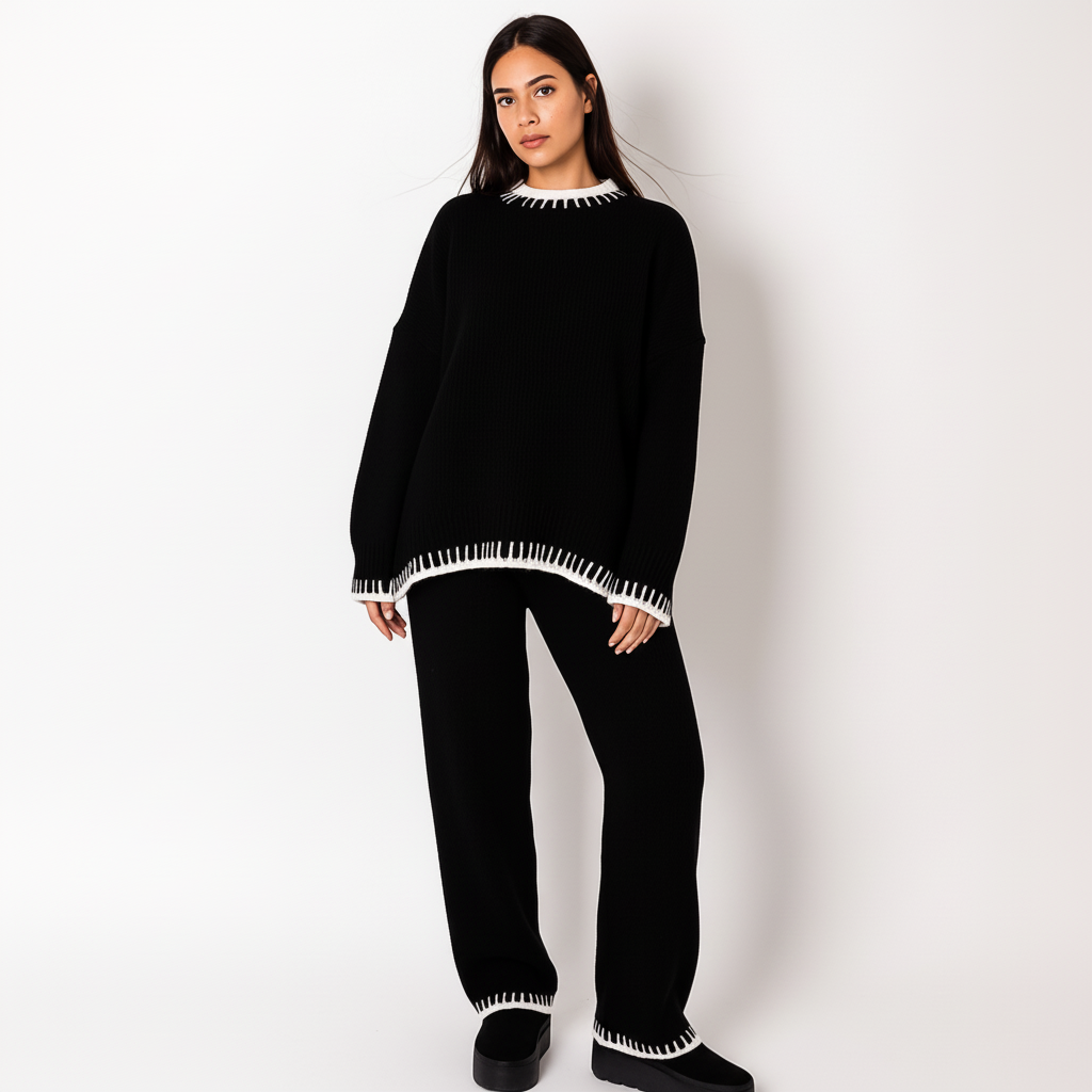 Prepare for the colder months with the Victoria Lounge Set, where comfort and style come together. This two-piece set, made from breathable and soft polyester, keeps you warm and stylish during autumn and winter. Featuring an elegant knitted sweater and comfortable wide-leg high-waist pants, this set is perfect for any occasion – whether you’re relaxing at home or planning a casual outing.